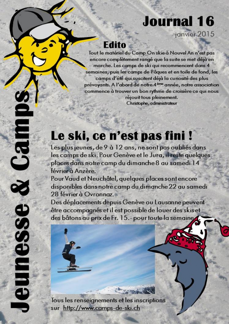 Camp de Nouvel An, annonce des camps de ski aux relâches et des camps et cours du printemps prochain.